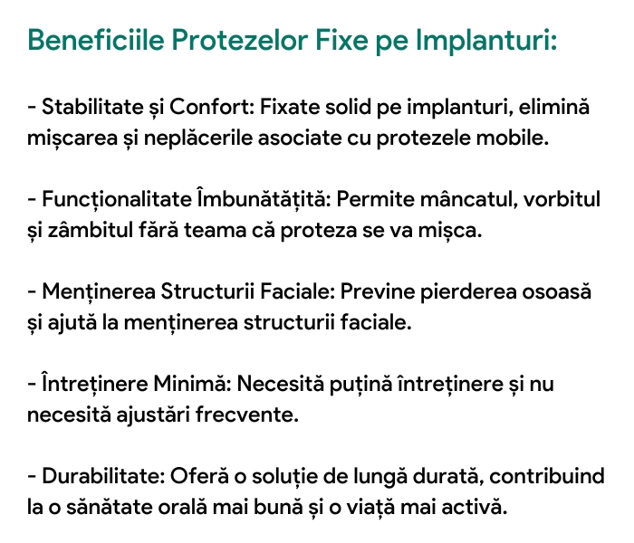 Protezele fixe pe implanturi reprezintă o soluție modernă care oferă stabilitate și confort, eliminând neplăcerile asociate cu protezele mobile. Fixate solid pe implanturi dentare, acestea permit pacienților să mănânce, să vorbească și să zâmbească fără teama ca protezele să se miște. Acest tip de restaurare nu doar îmbunătățește funcționalitatea și estetica, ci ajută și la menținerea structurii faciale, prevenind pierderea osoasă care apare în mod obișnuit în cazul edentației. În plus, protezele fixe redau pacienților încrederea și oferă o soluție durabilă care necesită întreținere minimă, fără vizite frecvente la dentist pentru ajustări. Alegând această opțiune, pacienții pot experimenta o viață mai activă și o sănătate orală îmbunătățită pe termen lung.
